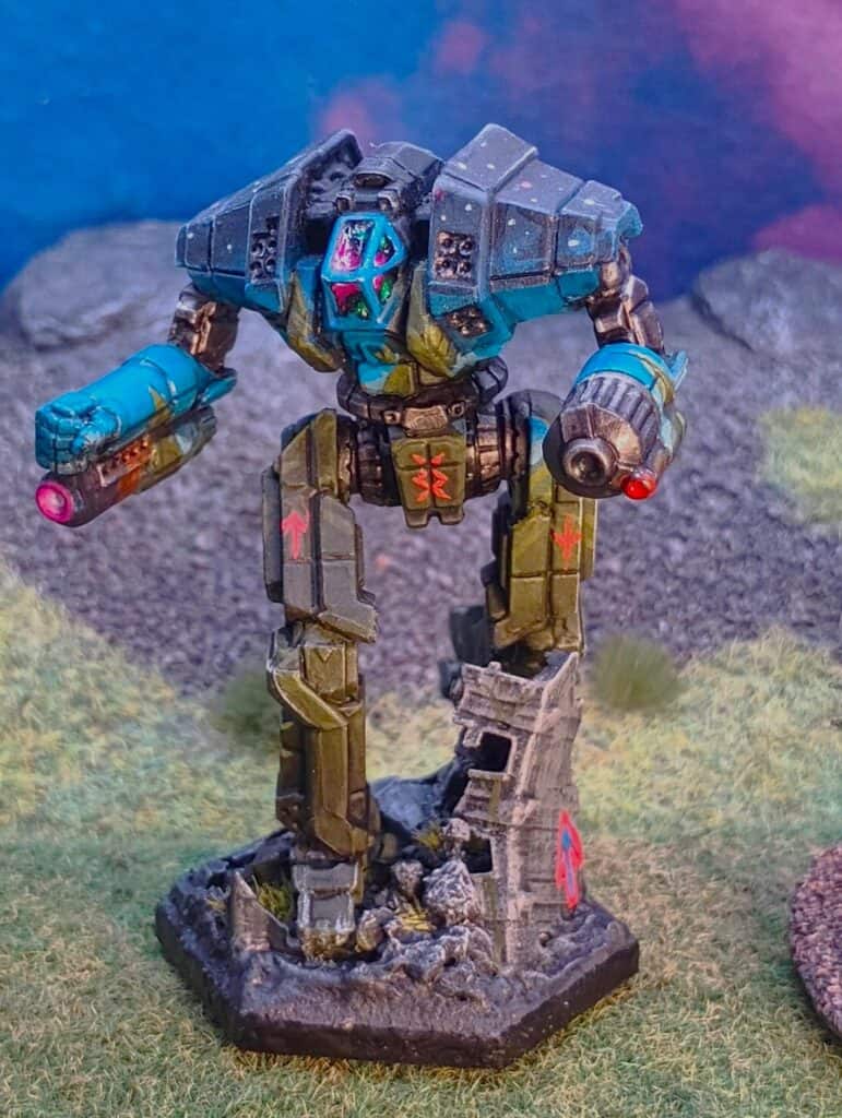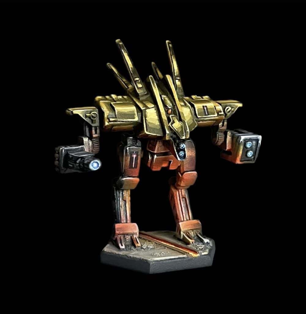 This mini, an Archangel Celestial Series Omnimech of the Word of Blake (praise Blake), was painted using non-metallic metal, and object source lighting techniques. The base was crafted using plasti-card atop a large IWM hex base. Using Army Painter speed paints, the color shifts from “zealot yellow” to “fire giant orange”, then fading into a cold steel/chrome using “cloudburst blue”.