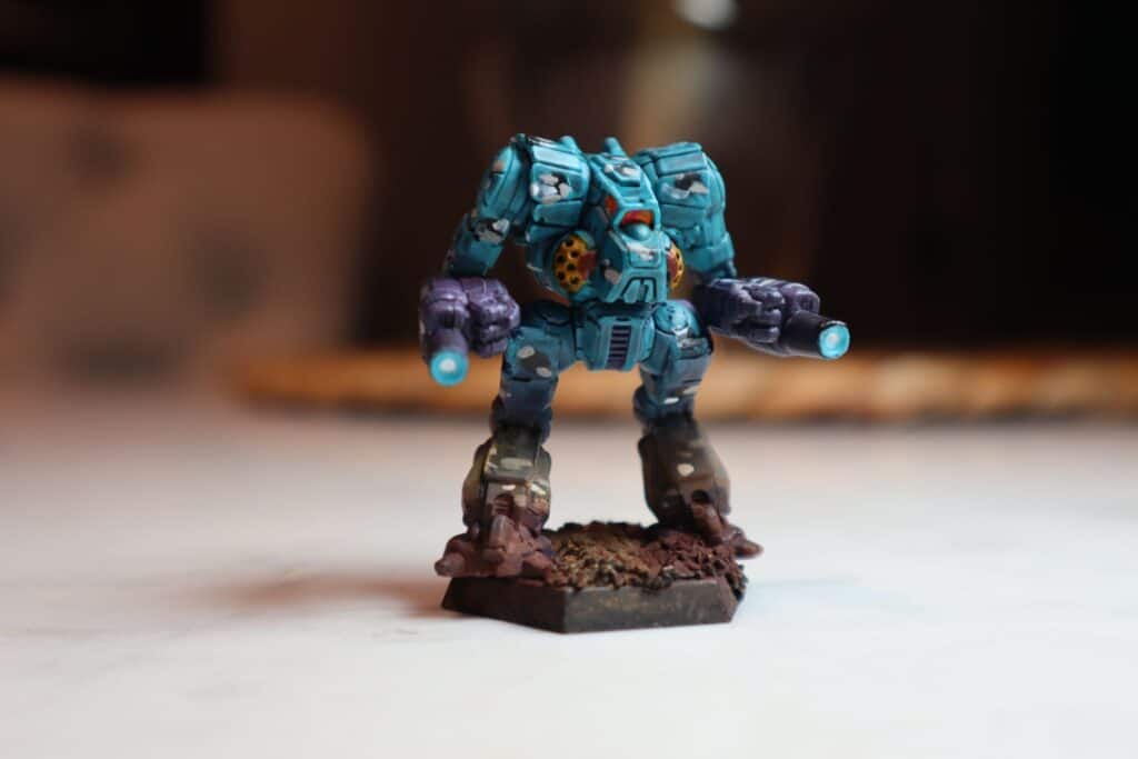 I was pleased to find a paint scheme in Delta Galaxy, Clan Goliath Scorpion that had quasi blobs in the pattern as well as some pretty stark hazard marking colors present. I really enjoyed the challenge of trying to paint cracked basalt slabs with lava showing through. I have painted lava on bases before, but never on a mech, so this was new territory for me, and I am happy I finished the miniature.