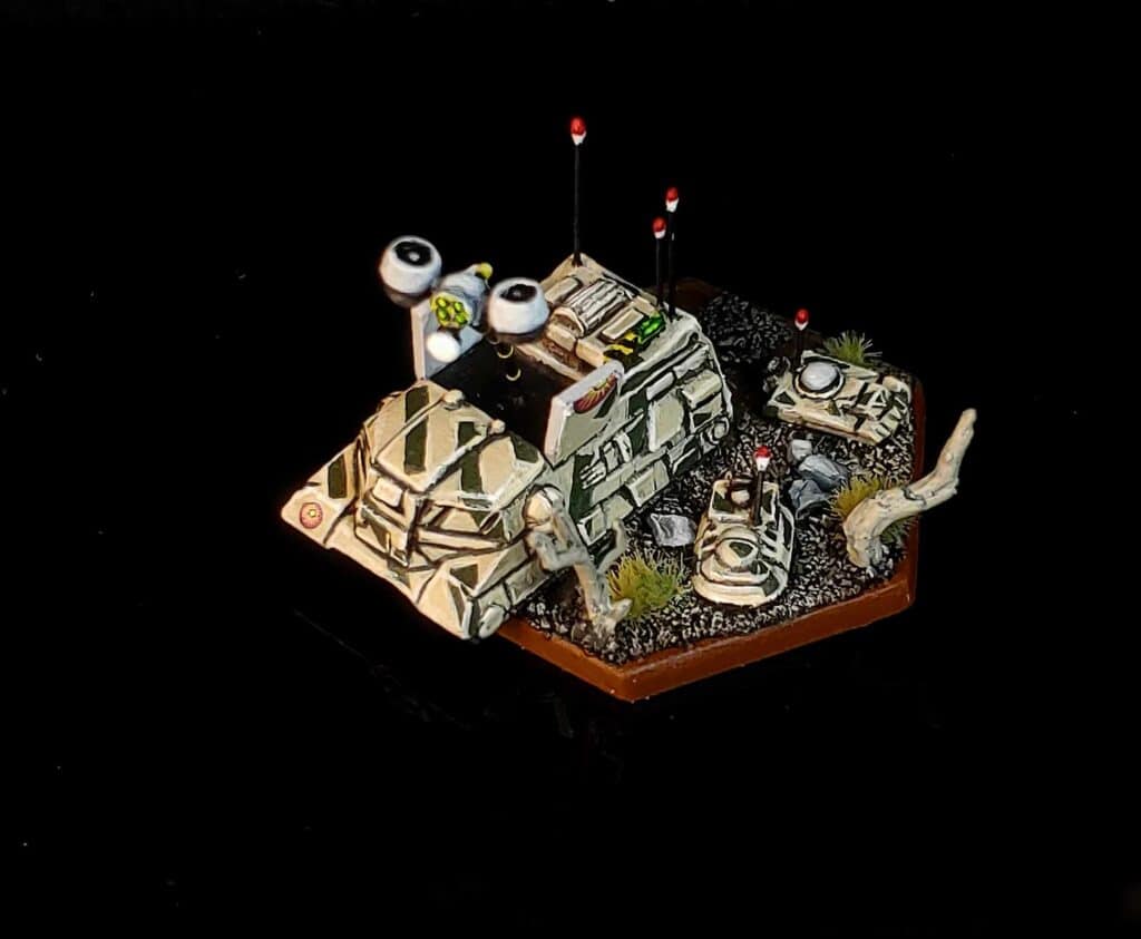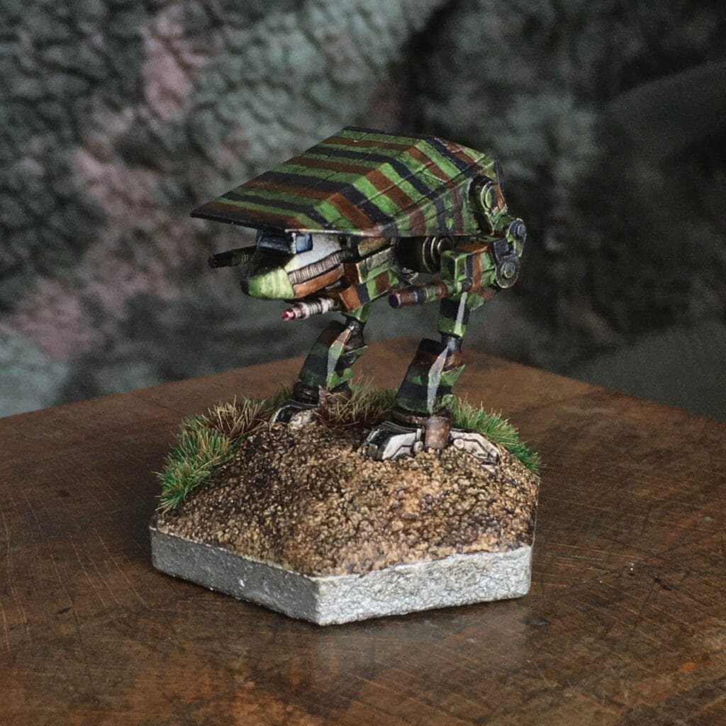 “I chose the Hi-Scout drone carrier, as it’s a pretty obscure unit that you don’t often see, and I love delving into the rarely seen corners of Battletech. I got the challenge desert+lines, which threw me for a loop. I tried a version of desert night camo, which was a disaster, so I did a version of camo from an old Russian ammo pouch I had in my basement. I converted the aerial drone out of a bunch of bits.”
