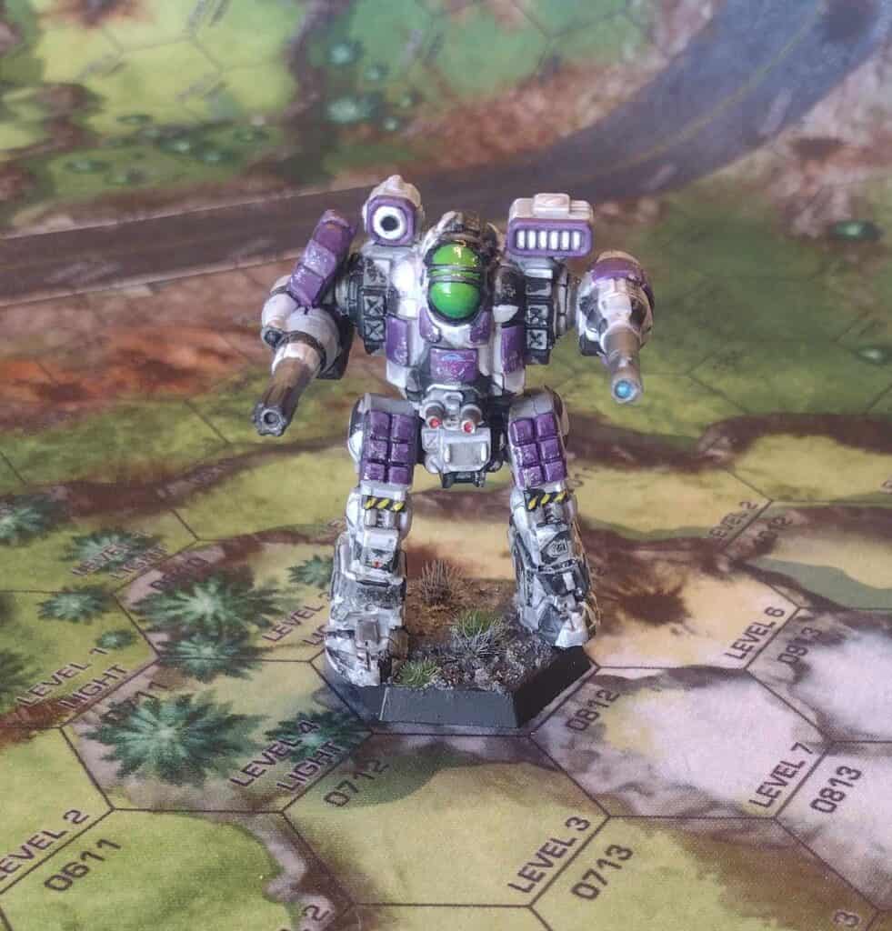 The white and black definitely contrast but really the purple and yellow are the contrasting colors. With this mech I wanted to give it a battle worn look and I used a bright silver metallic paint stippled.”