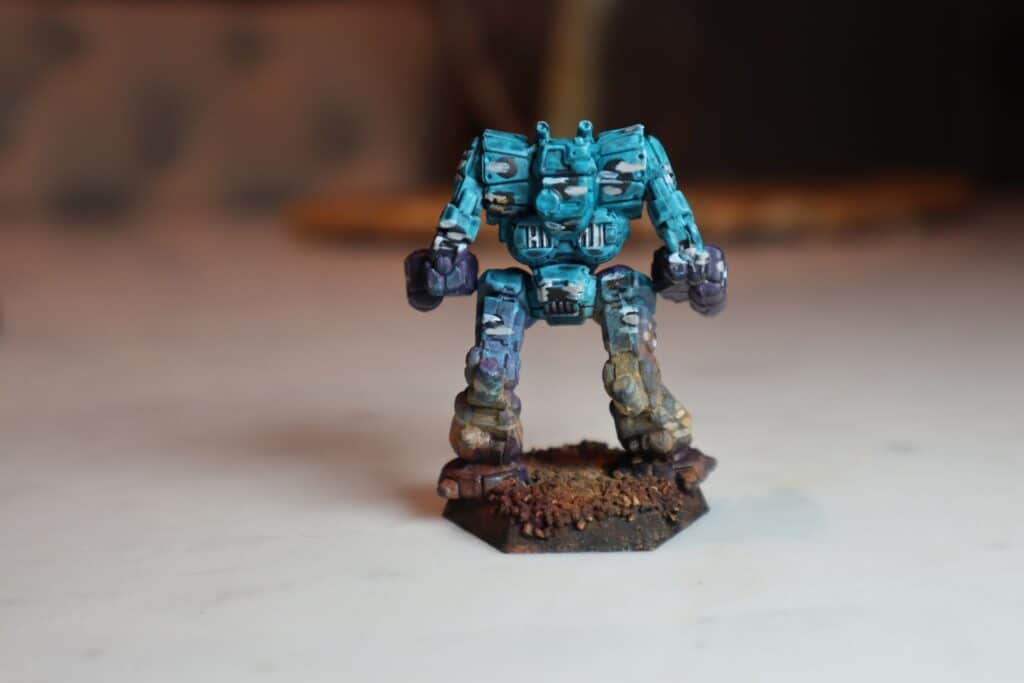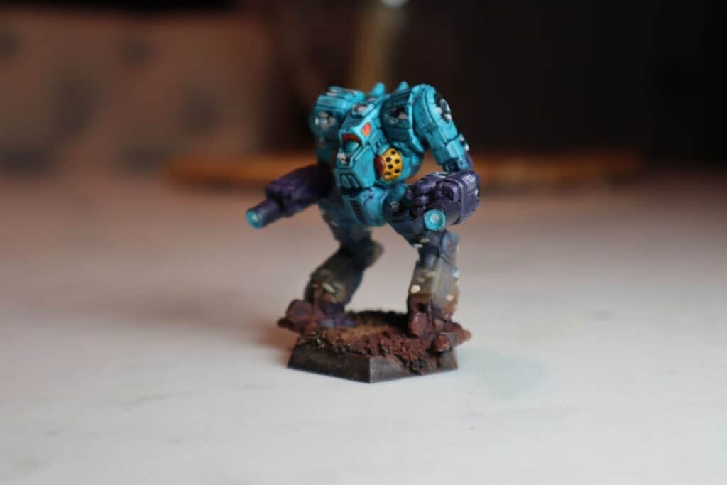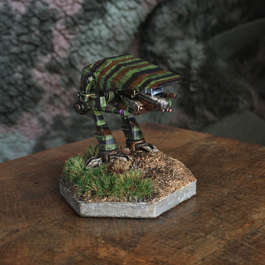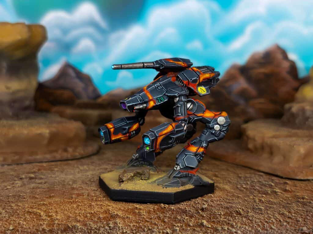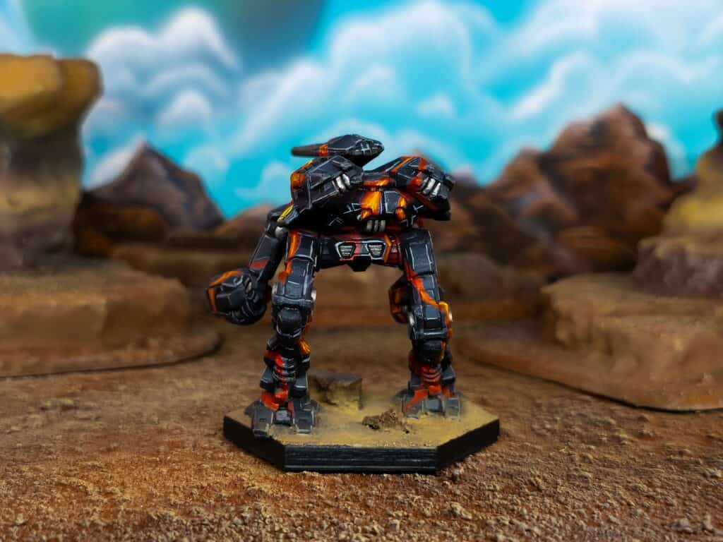 I was pleased to find a paint scheme in Delta Galaxy, Clan Goliath Scorpion that had quasi blobs in the pattern as well as some pretty stark hazard marking colors present. I really enjoyed the challenge of trying to paint cracked basalt slabs with lava showing through. I have painted lava on bases before, but never on a mech, so this was new territory for me, and I am happy I finished the miniature.
