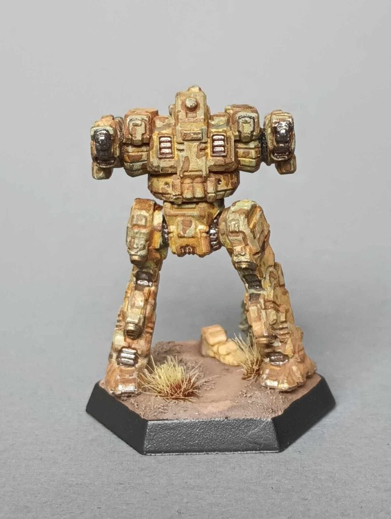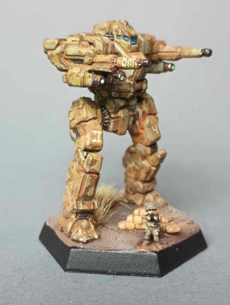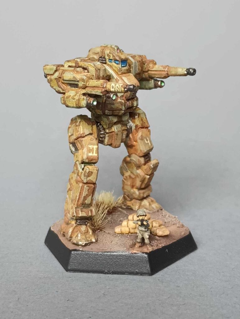 “Compared to some of my test subjec- er, fellow participants, I got off easy with my assignment. Battered military green machines just belong in BT. But in the spirit of the endeavor I wanted to take this a lot farther than my usual for wear and tear. So I decided to rust and stain a Blackjack to Kingdom Come; 6 different rust treatments, from textures and washes to various pigments, all layered and when necessary highlighted. Some of the effects are very subtle, but I wanted this rig to look super-flat and realistic. Hand-painted unit numbers and barrel blurb, some basing accoutrement and a lone footslogger in a shabby foxhole complete the gritty piece.”