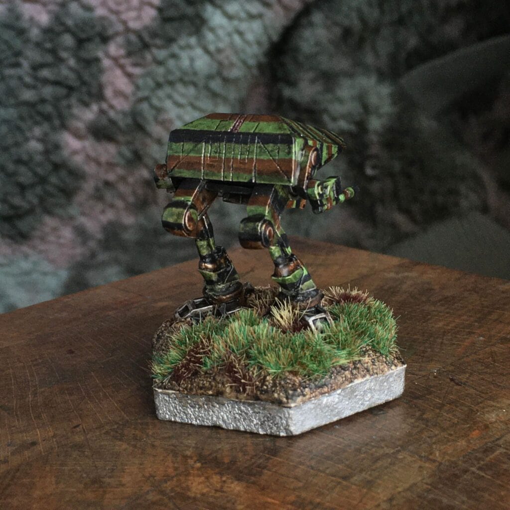 “When I found out my random roll results were spots and patriotic, I had a massive brain fart. But after some thinking, I remembered we were painting Battletech miniatures, and I decided to go with the Rasalhague 2nd Freeman standard camo scheme of starry sky with little spots of stars and hand painted trees forming sort of a tree line.