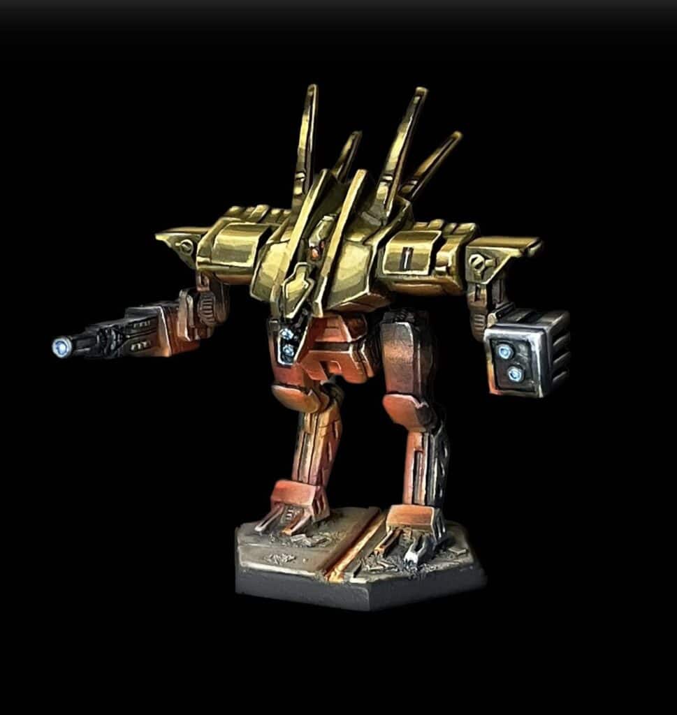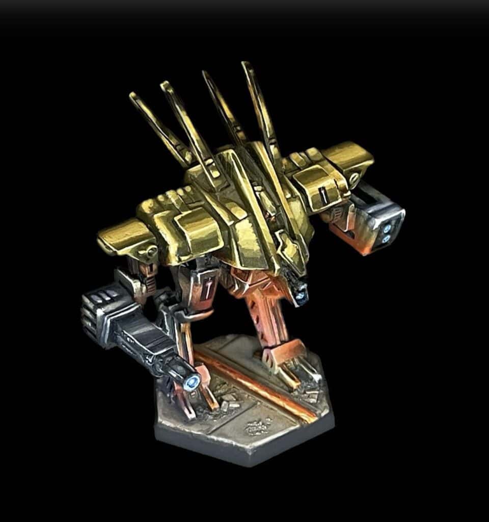 This mini, an Archangel Celestial Series Omnimech of the Word of Blake (praise Blake), was painted using non-metallic metal, and object source lighting techniques. The base was crafted using plasti-card atop a large IWM hex base. Using Army Painter speed paints, the color shifts from “zealot yellow” to “fire giant orange”, then fading into a cold steel/chrome using “cloudburst blue”.