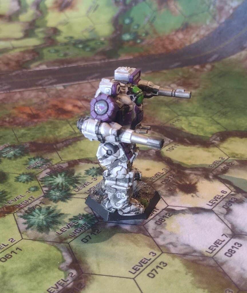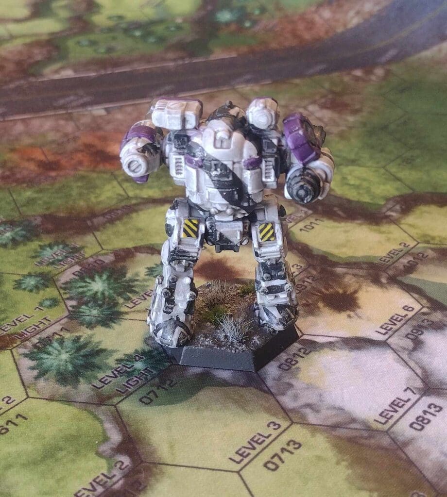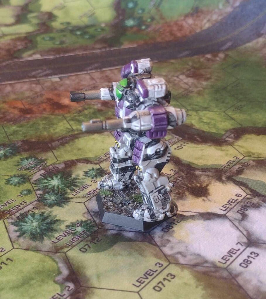 “Dazzle camouflage and contrasting colors are the theme here. I looked to World War I warships for inspiration and noticed they used lines that would run at different angles and I found them either offset, or perpendicular to each other. On this mech I best achieved that on the legs. For the torso I was just trying to break up the obvious outline. I originally intended for a different effect with the purple and yellow but couldn’t pull it off so in the end I opted to riff off of the 1st Free World Guards who use a white and purple with black accents.