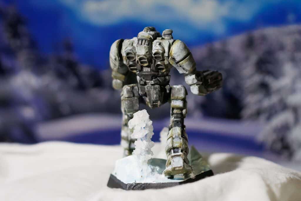 The white and black definitely contrast but really the purple and yellow are the contrasting colors. With this mech I wanted to give it a battle worn look and I used a bright silver metallic paint stippled.”