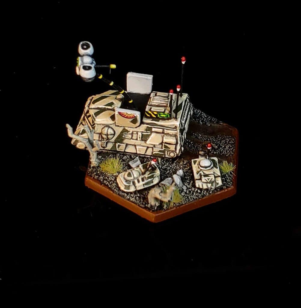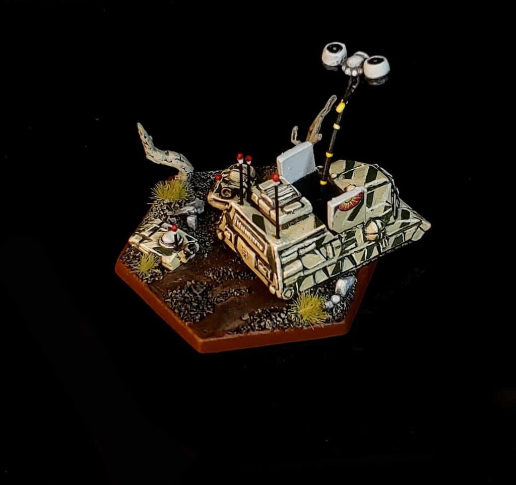 “I chose the Hi-Scout drone carrier, as it’s a pretty obscure unit that you don’t often see, and I love delving into the rarely seen corners of Battletech. I got the challenge desert+lines, which threw me for a loop. I tried a version of desert night camo, which was a disaster, so I did a version of camo from an old Russian ammo pouch I had in my basement. I converted the aerial drone out of a bunch of bits.”