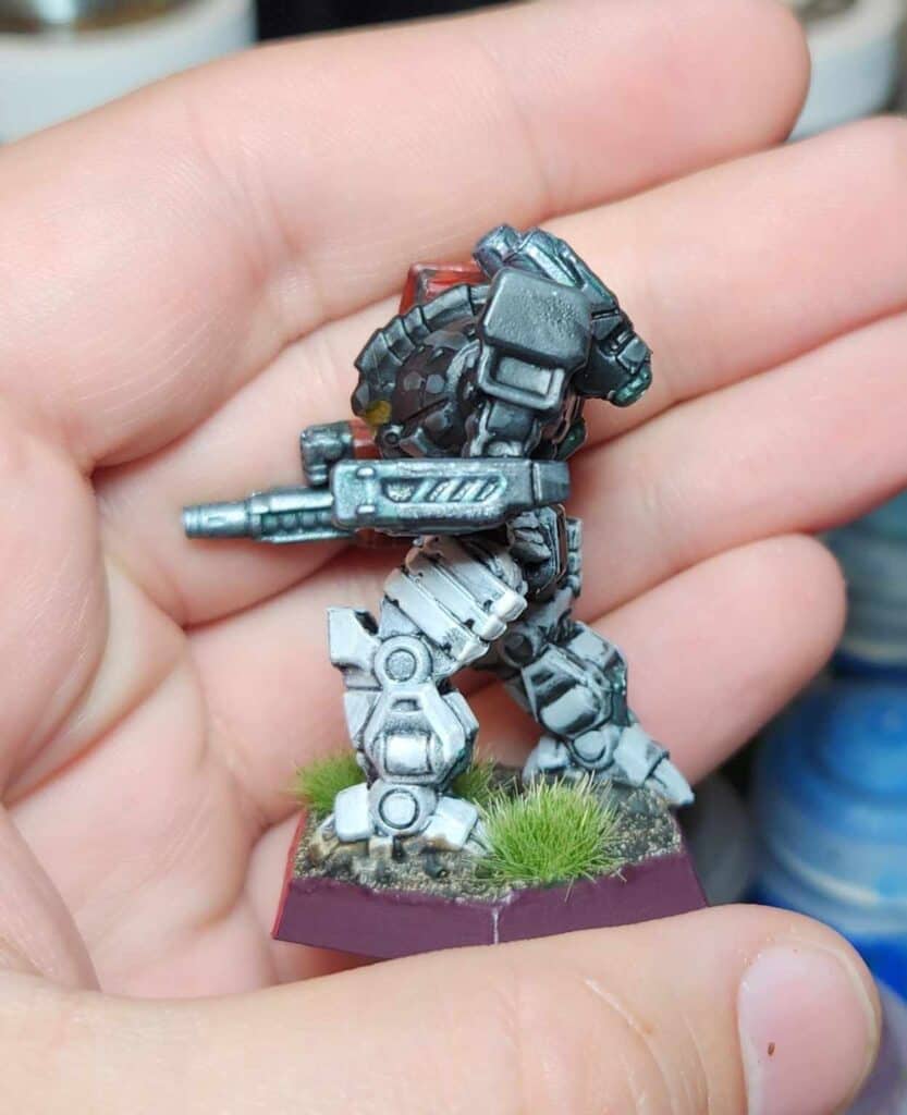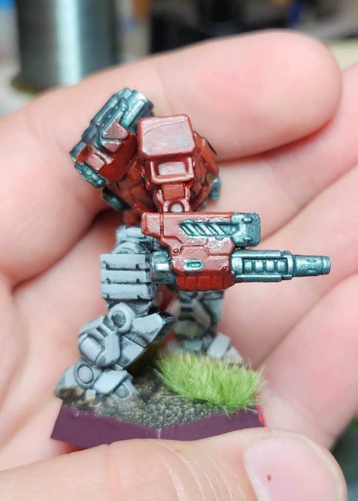 The next step was finding a suitable thing to feel patriotic about: money! I looked up some Solaris stables and found one that had no models painted on Camospecs, the Bulldog Cooperative. Even better, it was mentioned their mechs always featured red, and then usually black, white, and/or gray. Four colors, which is exactly what I needed. Though my model is by no means the most impressive in the group, it was a fun project that let me test some new paints and do something out of the ordinary.”