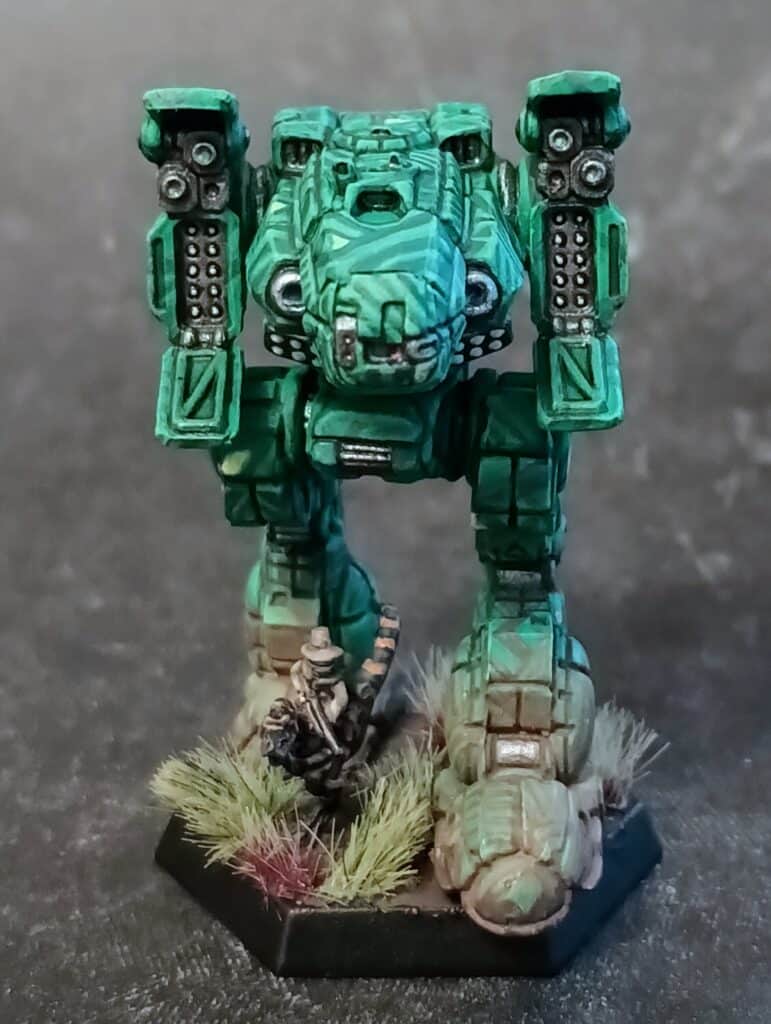 Truth be told, I had a hankering for a dazzle-painted mech for some time now, if only to see if I could execute it. In a way, my initially demoralizing assignment was serendipitous. But the constraint of a “jungle” paint palette gave it some unexpected pizazz, and I think turned the pattern into a stylish if plausible one. Dark green stripes on the upper body and legs, and dark brown on the bottom: Perfect for blending in among the vines and branches of a continent spanning emerald inferno.