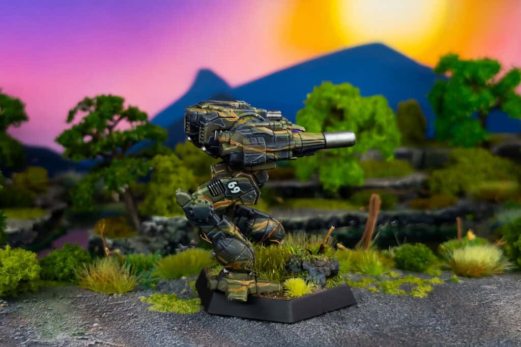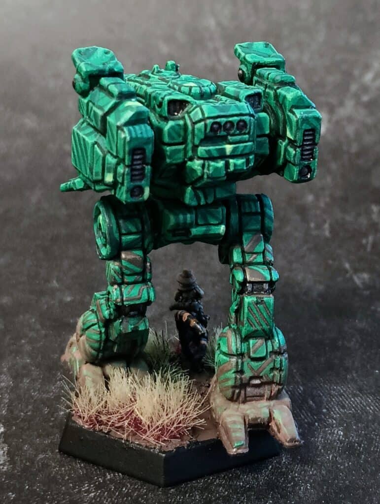 This Stalker is modded with flipped arms. It looks better and I will die on that hill. On the base, Tracker Dan atop his trusty steed, ready to ferret out any ambushing infantry or fleeing pilots. They’ll be lucky if dehydration claims them.”