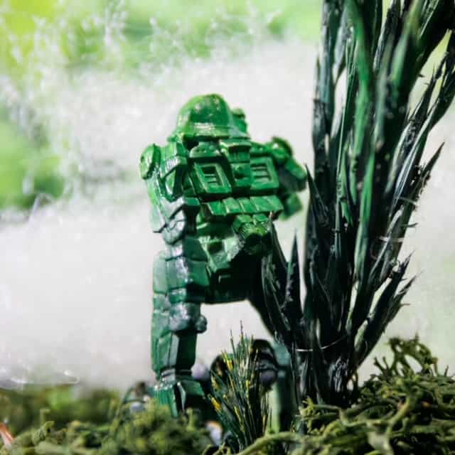 First were my color choices, as my first set of requirements was that the mech needed to be 2 toned. I went with a white and green color choice, and I wanted to make the white and green look muted and worn as if it were the camouflage colors on an alpine pattern WW2 tank. The second requirement was that it needed to be a camouflage pattern so that made things simple. But just painting a mech a 2-tone camo pattern felt like it would be dull, and I could be done with it in less than an hour. So, after brainstorming with the guys in the chat, and after some digging through my parts bin, I decided to add infantry, terrain features, a little bit of a story for the mech and infantry, and I knew I wanted to spice it up with some dead bodies. Why dead bodies? Why not dead bodies. One squishy body where the King Crab purposely stepped on an enemy soldier revealing only his legs, and another body laid out on a fallen fence due to multiple gunshots from some support infantry hiding just behind the barricade and standing fence.