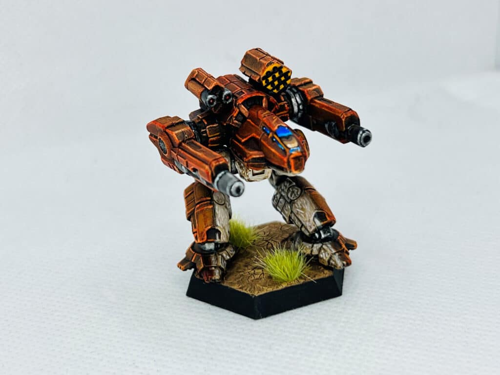 The mech is painted in colors adhering to the CamoSpecs entry for Clan Hell’s Horses Iota Galaxy