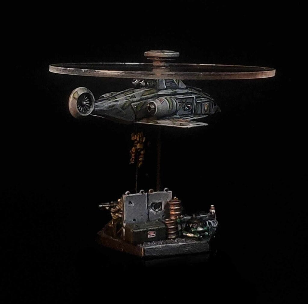 “Davion MI6 Rabid Foxes Special Forces, deploying from a Kestrel VTOL. Kestrel VTOL is 3d printed with etched rotor disc by Death Ray Designs and Infantry are Khurasan Warforce Reserves Infantry.”