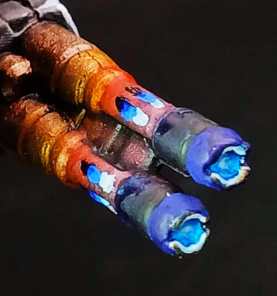 The Barrels and heat treatment for both the plasma cannons on the right arm and the PPC’s on the left give off a different glow and heat signature, for these I used various products from Citadel to Vallejo Metal Colors. For the Canopy I did roughly a 6-color transition for the red jeweling and 3 color transition for the green part of the jeweling, for these I used Duncan’s 2 thin coats paints for their thinning ability to get to an extremely thinned down filter and still have enough pigment for beautiful fades and color transitions.