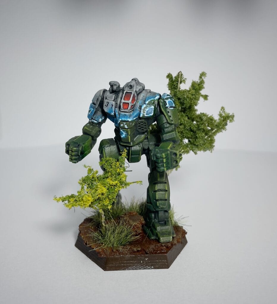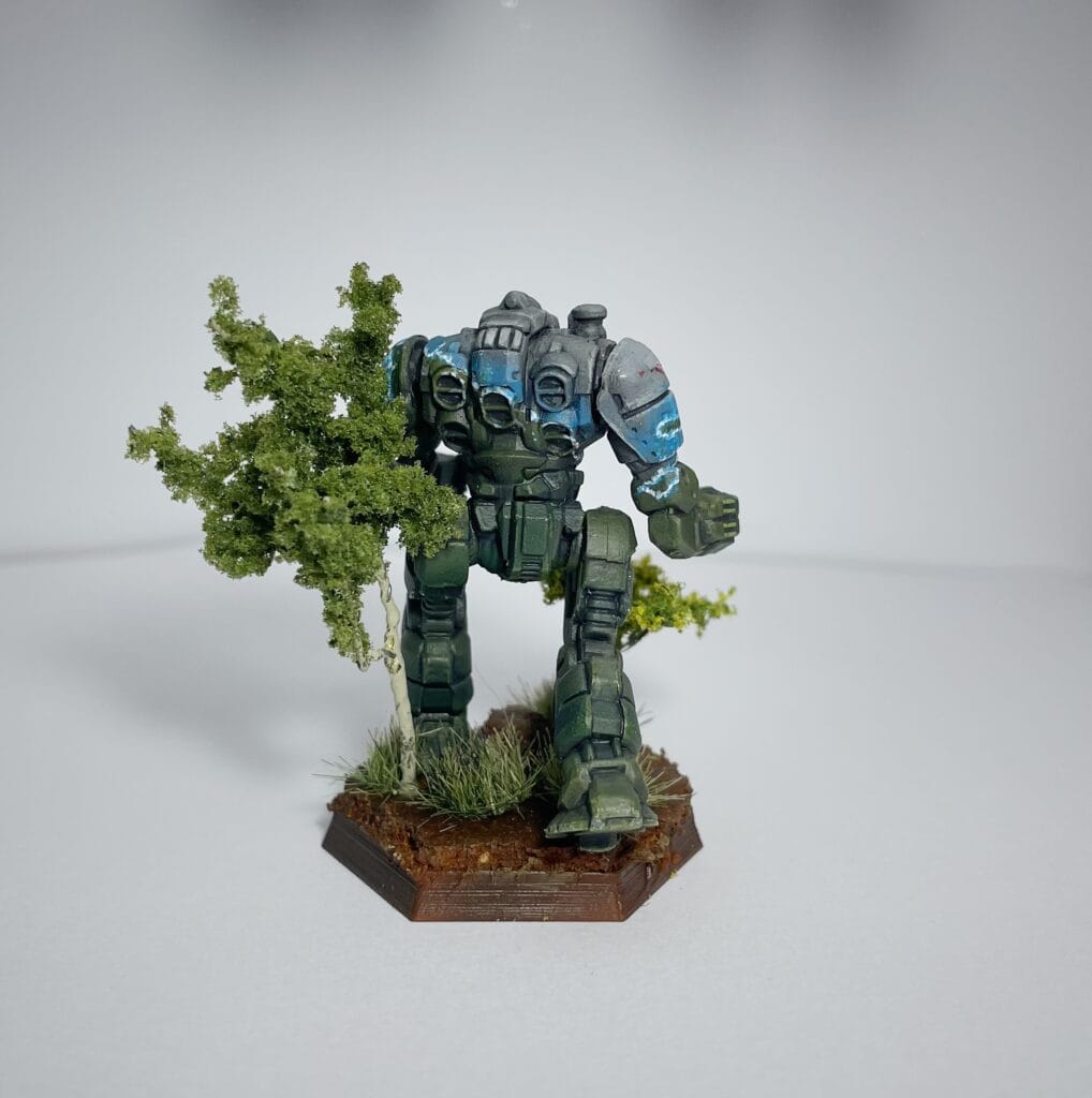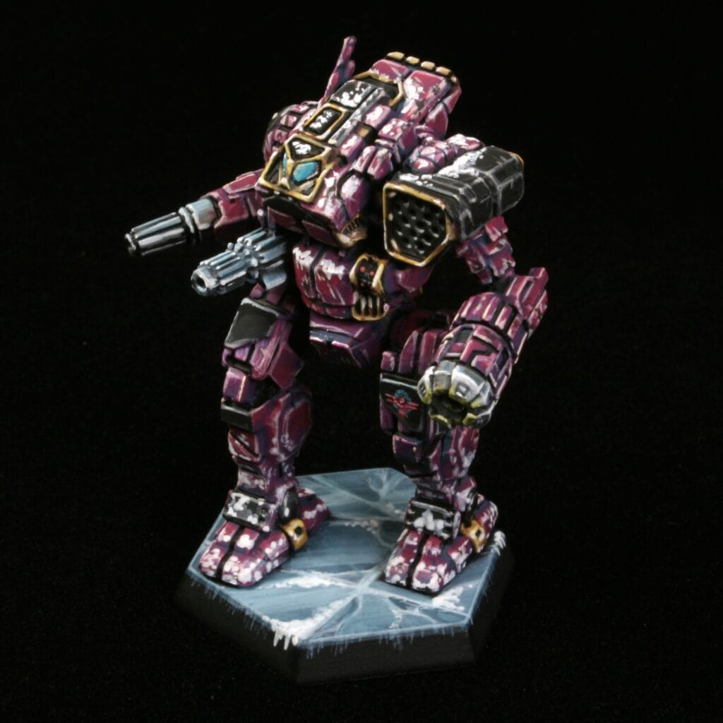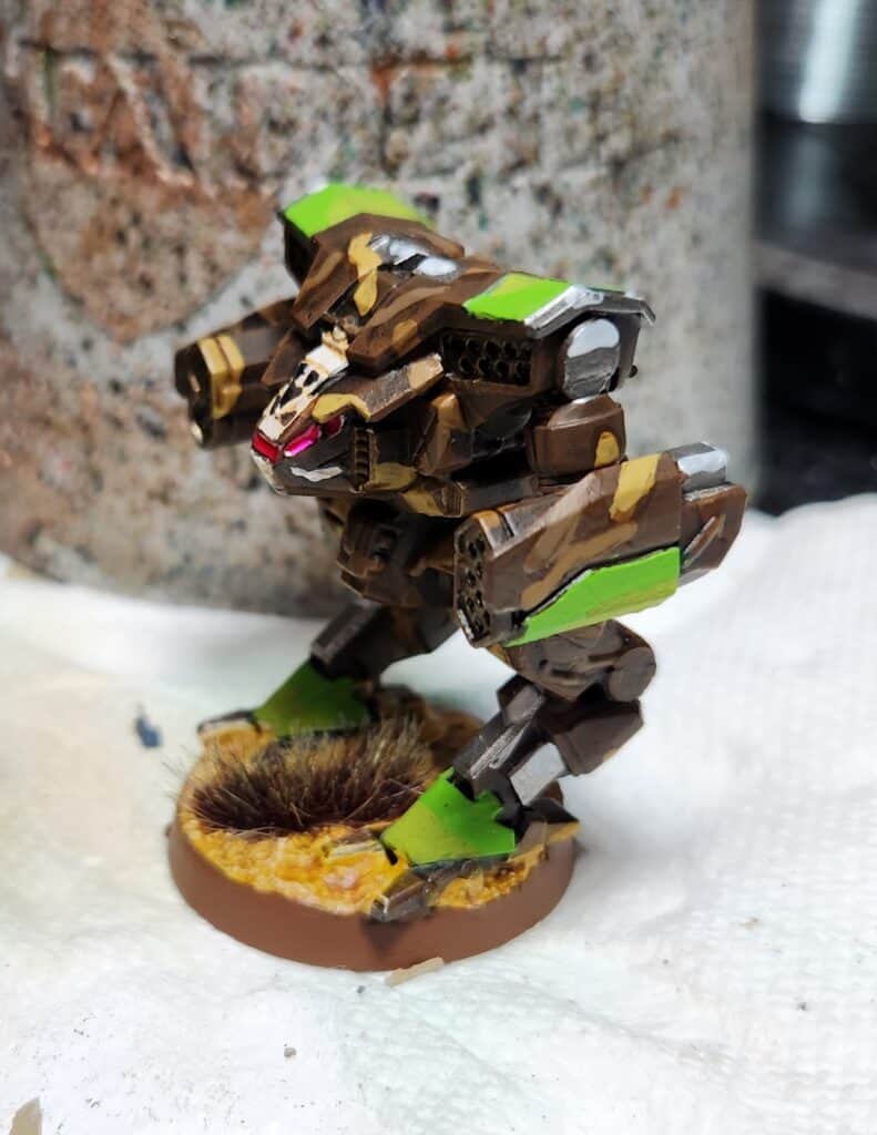 “This mech is part of my group’s alternate history for BT, specifically us deciding to do some more expansion on the Homeworld Clans post-Reaving. Though the model is an Osteon, the mech is known to Clan Havoc Hog as a “Warthog”, a total conversion of the Osteon from expensive wunderwaffe weapon, into a fairly sturdy and inexpensive garrison unit. The paint scheme is derived from one of the Wolf keshiks, presumably due to an early member of Havoc Hog being a captured member of the keshik. Paint roll was animal print and woodland!”