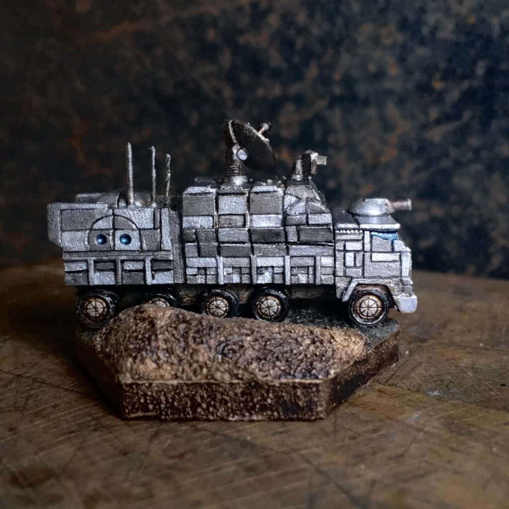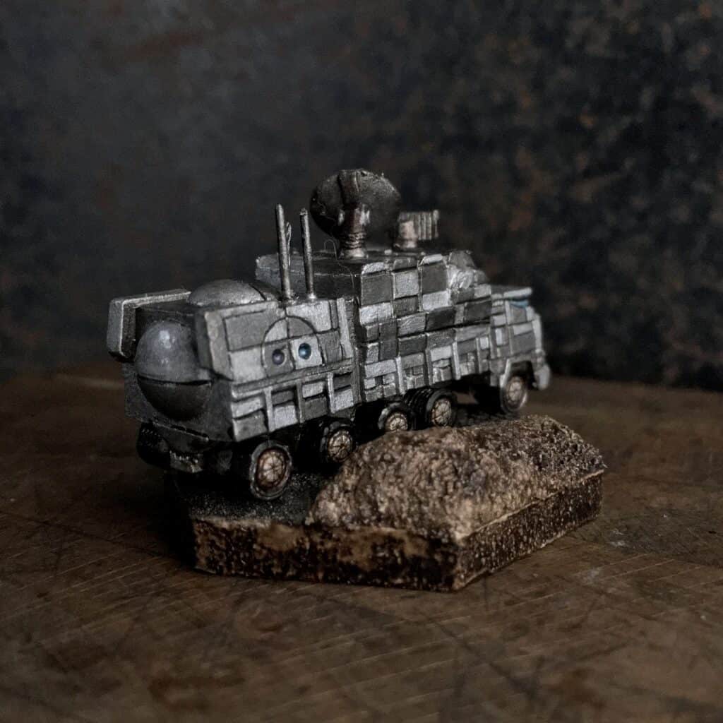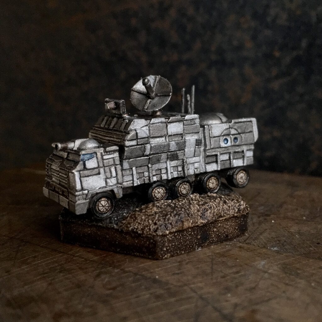“This is my entry for June’s Paint Roulette. I rolled Urban and Camouflage, and so I went with a very subtle military style grey and dark grey 2 tone urban spike camo pattern on an Alpha Strike Masakari along with some 3D printed highway dividers and a Khurasan minis pewter 6mm car, but due to the nature of urban camo being dull and matt to better blend in with buildings and rubble I did an airbrush zenithal using some of the neutral grays from ProAcryl, I decided to focus primarily on the parts that would have the most color.