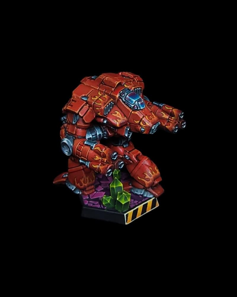 Everything in the main red of the model is based around Kimera The Red. I hadn’t had a ton of a chance to use my Kimera paints and a one off fun project like this is a perfect chance to give them a test drive. The color made the second choice easy, if you’re going to paint something bright red then flames are the answer. I was able to push it to very dark, desaturated burgundy colors for the lining and shades to bright oranges for the tips of the flames but the base color is present in all of it. After everything was down I also glazed over everything with that base red again to pull it all together even further and keep that strong red running through everything. The lining and edges are shaded and highlighted pretty strongly on this, everything being variants of the same hue means I had to lean into value contrast way more. It gives everything a little more cartoony look I think, but it all fits with what is apparently my style for painting Battletech stuff.