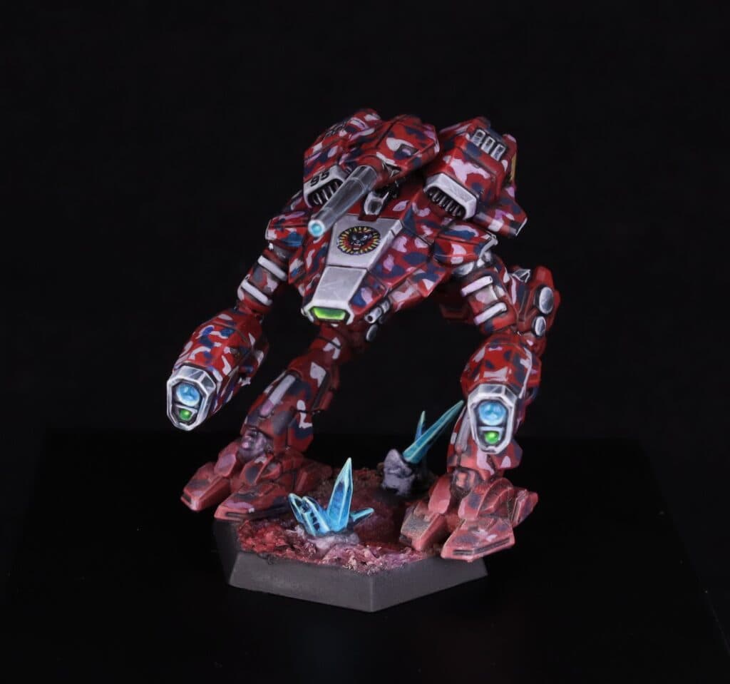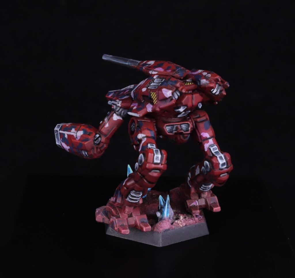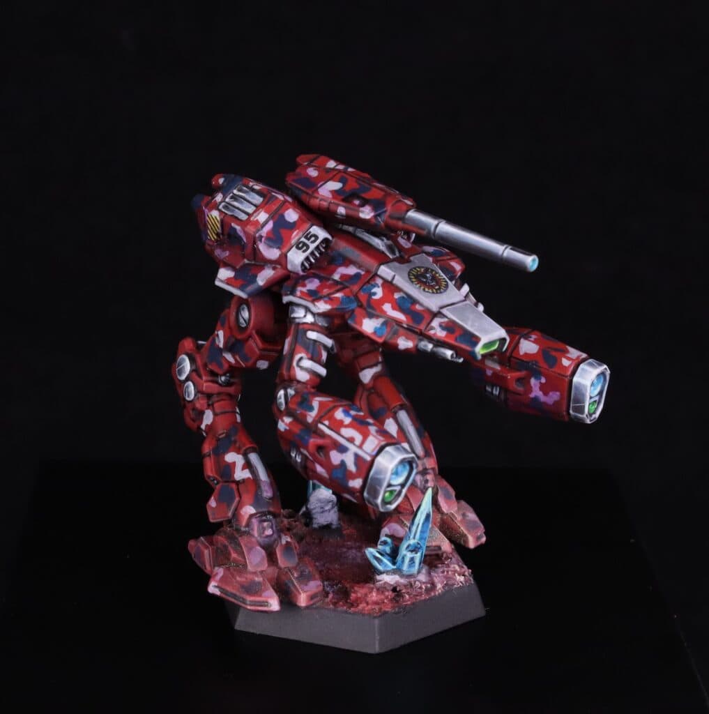 Ever the subtle hunter, the Nova Cats paint their machines in appropriate camouflage. These warriors of Sigma Galaxy painted their machines in mottled red, white and blue camo to match the arid Martian environment of the crystal fields of Patriocys. The crystals were the subjects of many trials as they proved a valued resource.