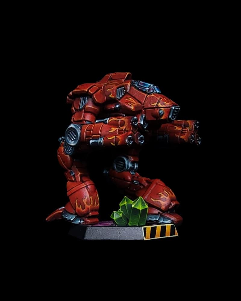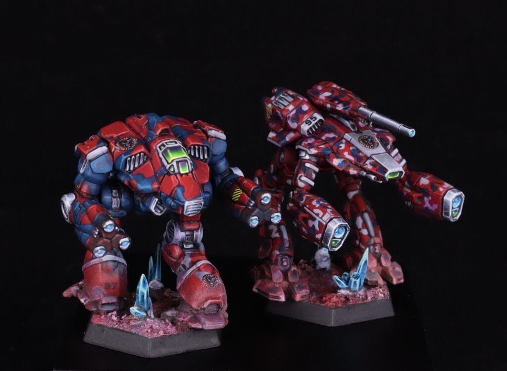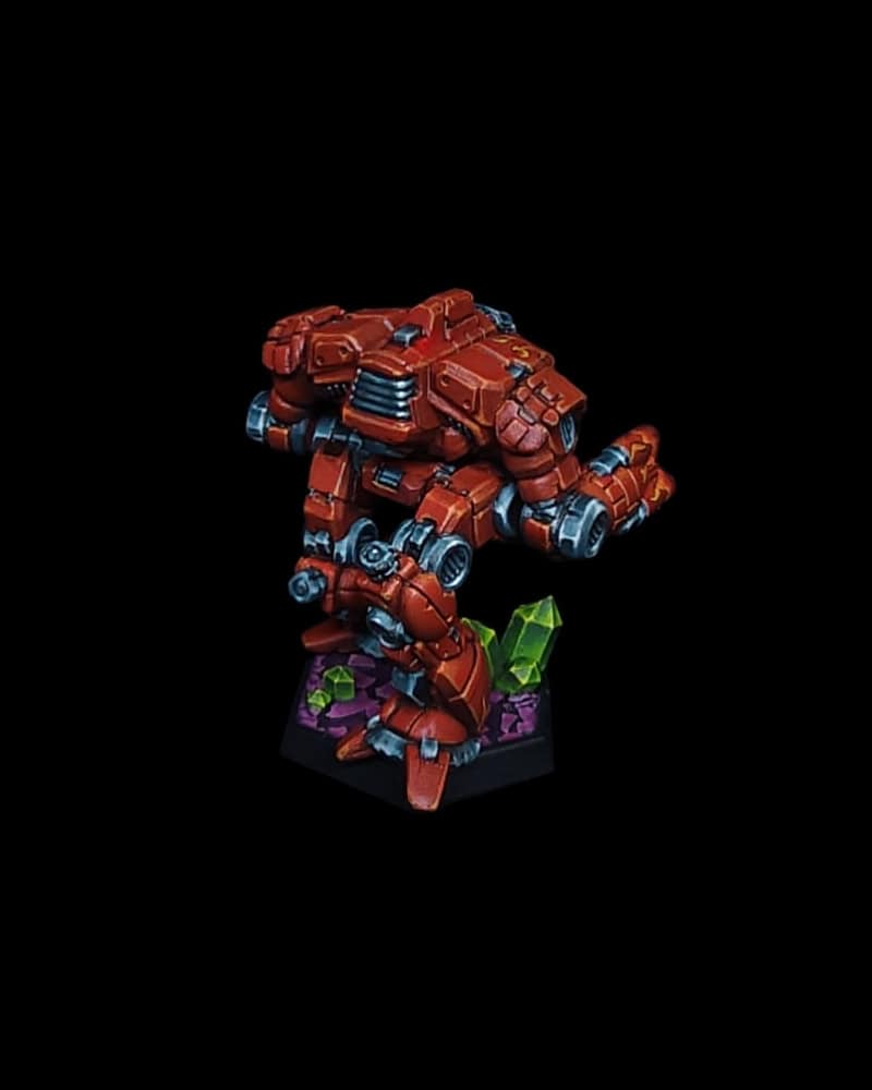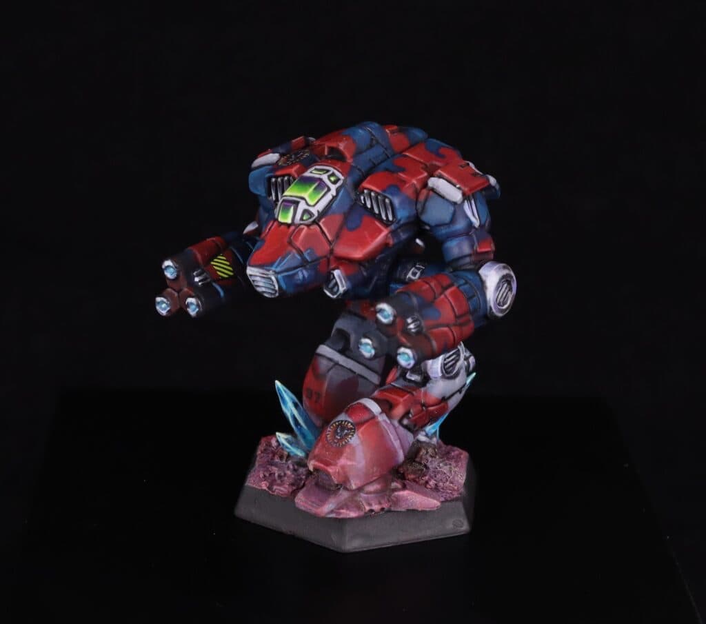 Ever the subtle hunter, the Nova Cats paint their machines in appropriate camouflage. These warriors of Sigma Galaxy painted their machines in mottled red, white and blue camo to match the arid Martian environment of the crystal fields of Patriocys. The crystals were the subjects of many trials as they proved a valued resource.