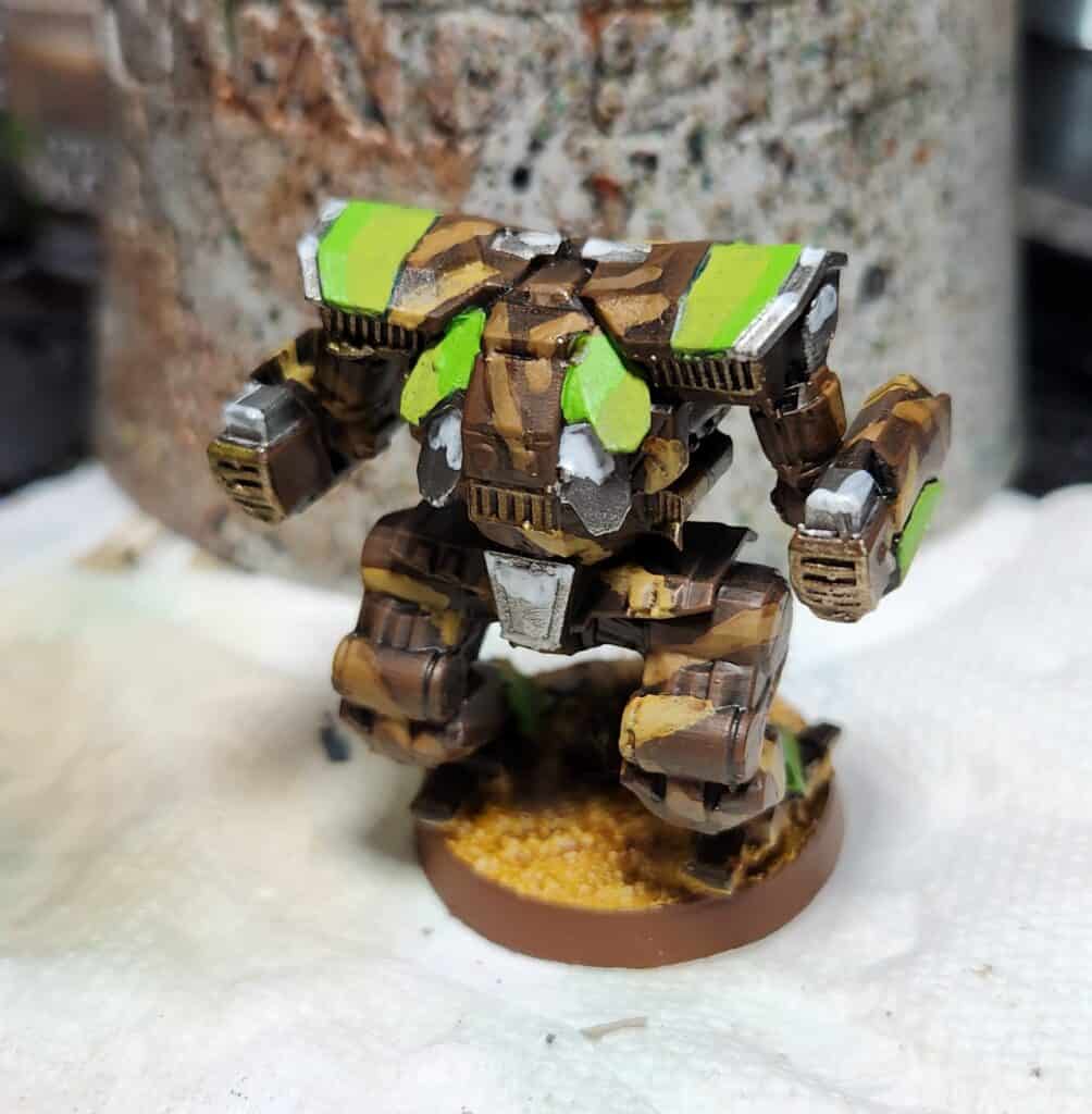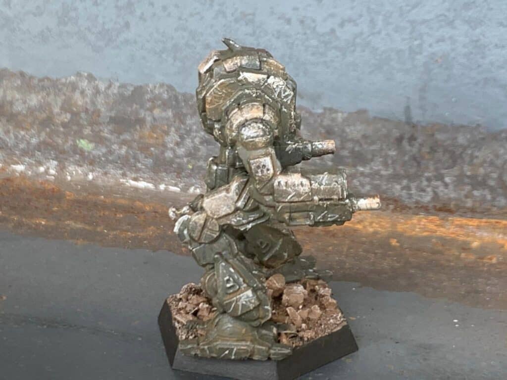Metallics used extensively over save the panel lining, sensor domes, butt pad and forearm on the laser rifle. Paints are a combo of Vallejo Model Color, Vallejo Mecha, Vallejo Shifters, and Army Painter Fanatic. I subtly highlighted the upper surfaces with increasing amounts of silver and aluminum for more pop from ambient light. Colorshift paints on the lenses and canopy, but the latter is so recessed in the head it is in hard shadow all the time.